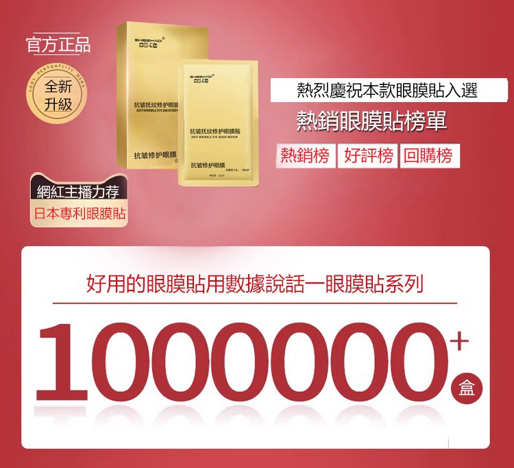 11分鐘前每晚貼一貼,輕鬆淡化眼紋、眼袋,多買多送,僅限今天!免費包郵,不滿意直接退!快下單試試吧,用了你不會後悔! - 【限時瘋搶】2入組NT$1190(16對32貼初見成效)