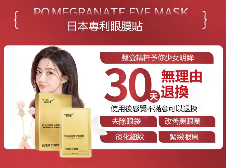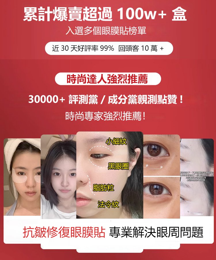 半小時前每晚貼一貼,輕鬆淡化眼紋、眼袋,多買多送,僅限今天!免費包郵,不滿意直接退!快下單試試吧,用了你不會後悔! - 【限時瘋搶】2入組NT$1190(16對32貼初見成效)